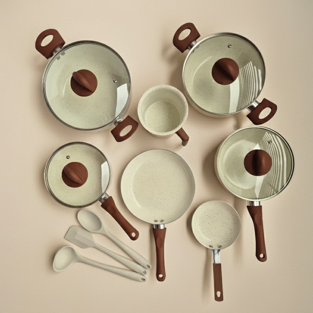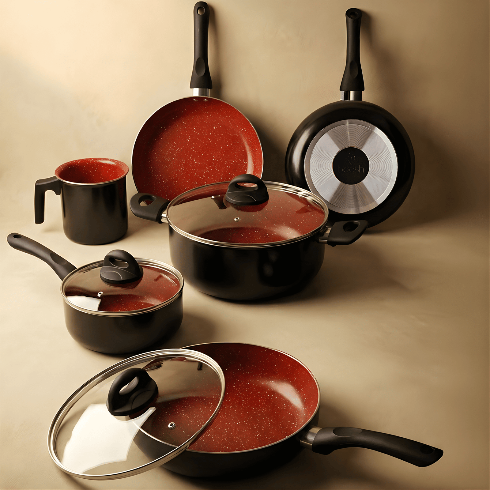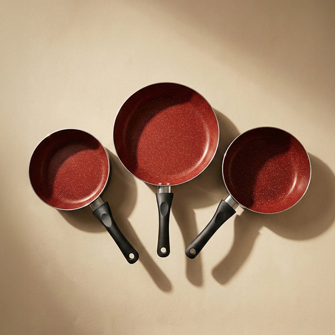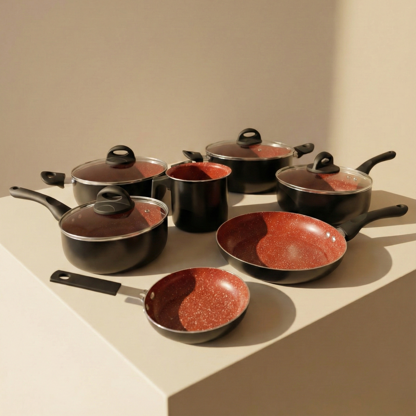 Já o acabamento em Preto & Vermelho com granité branco traz um visual acolhedor e sofisticado, com cabos em silicone Soft Touch que garantem segurança e firmeza no manuseio.